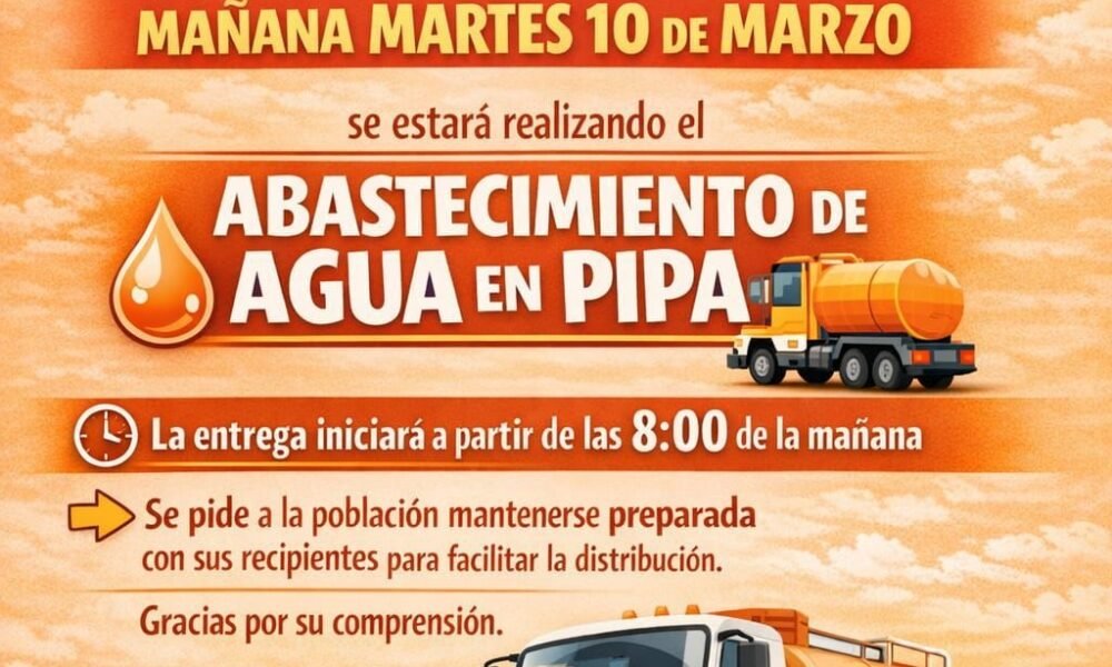 Ante el desabasto de agua que se registra actualmente, el Gobierno Municipal informó que este martes 10 de marzo se llevará a cabo el abastecimiento del...