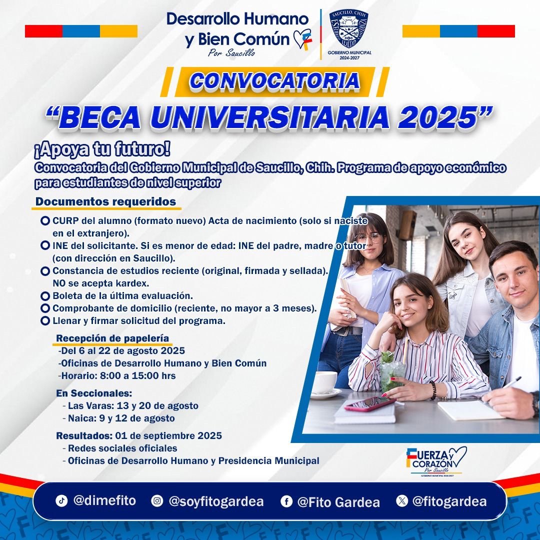 A partir del 6 de agosto, Fito Gardea abre convocatoria de becas universitarias para apoyar los sueños de la juventud Saucillense.