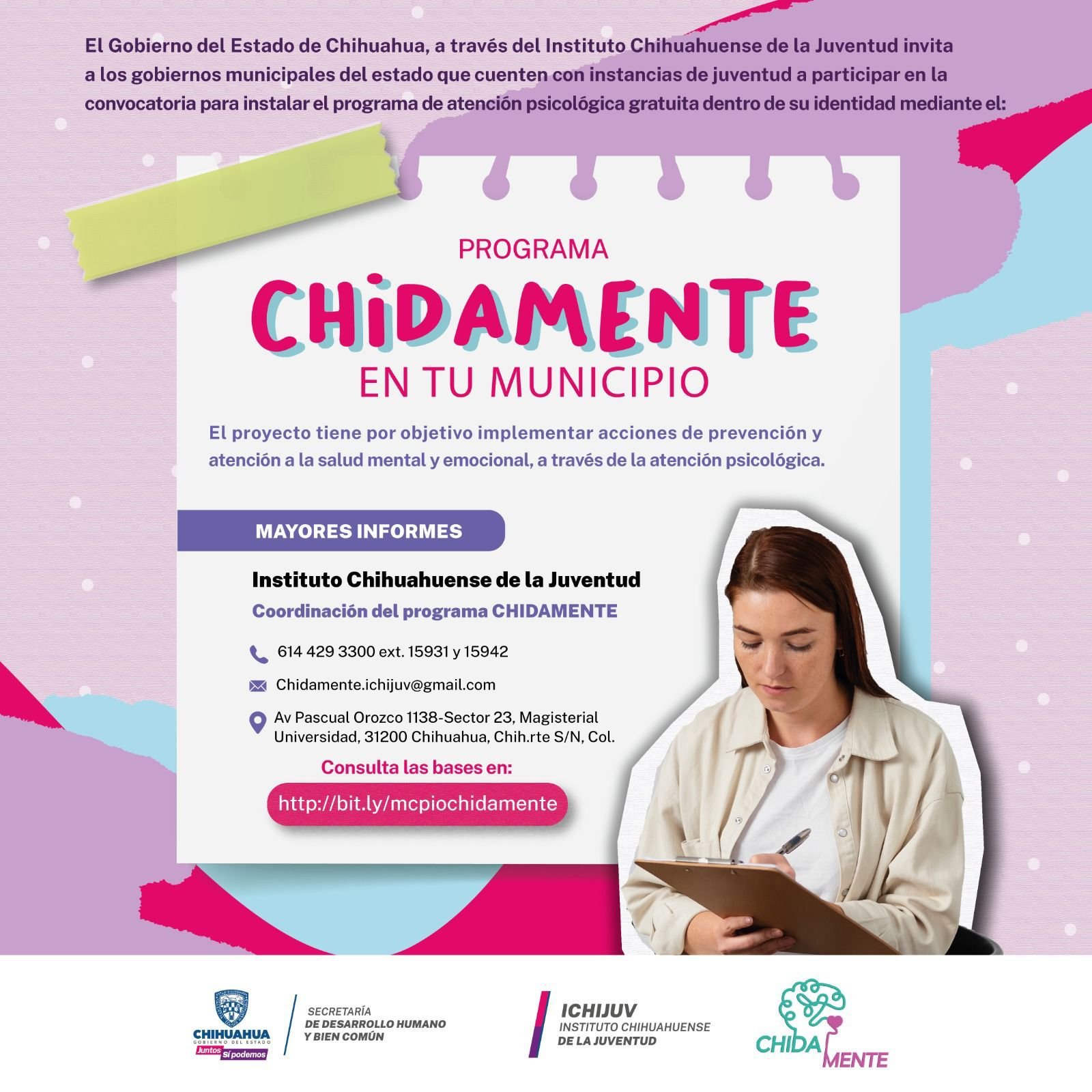El Gobierno del Estado, a través del Instituto Chihuahuense de la Juventud (ICHIJUV), abrió convocatoria para que los gobiernos municipales del estado cuenten con la atenión del programa de atención psicològica gratuita “ChidaMente”.