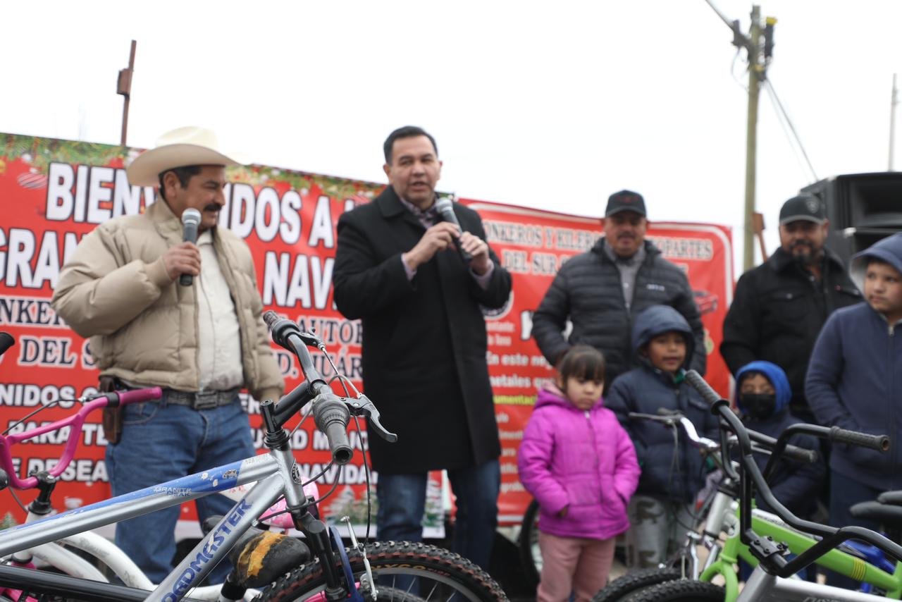 El edil aprovechó para rifar y entregar una bicicleta a uno de los niños asistentes, quien entonó una canción navideña para poder ganársela.