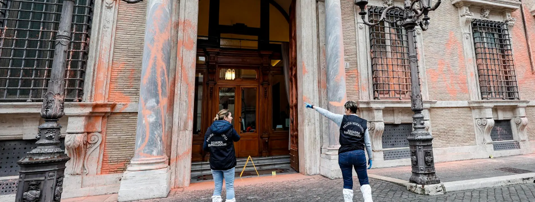 Activistas climáticos pintan de rosa la fachada del Senado italiano