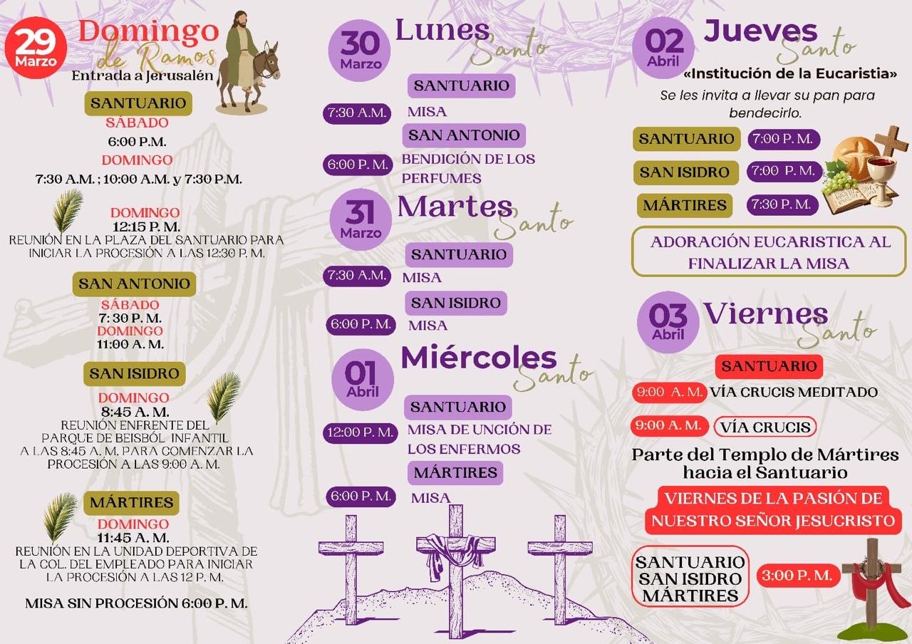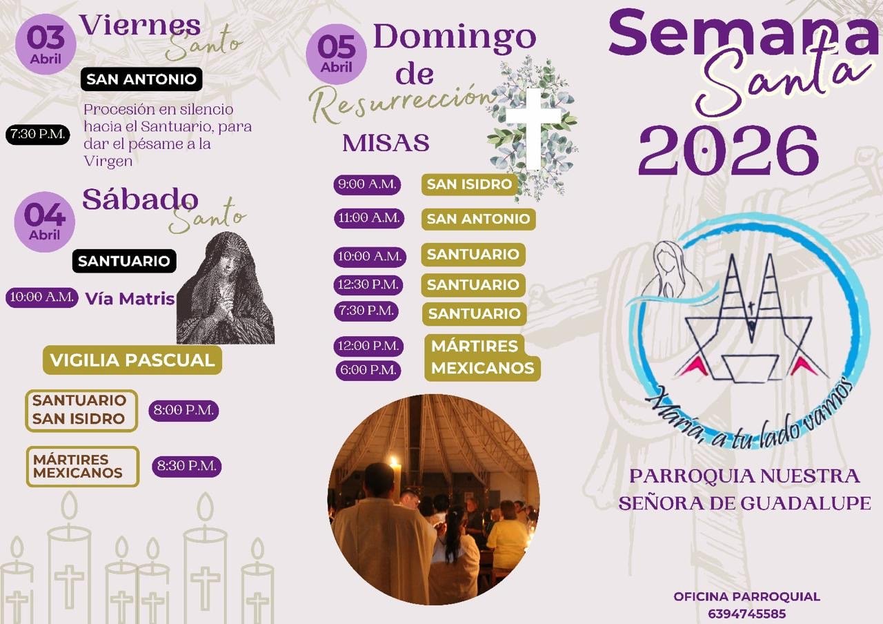 Siguiendo la exhortación de nuestro Arzobispo Don Constancio Miranda Weckmann, quien nos llama a vivir el misterio pascual como un verdadero encuentro con Cristo vivo, la Parroquia de Nuestra Señora de Guadalupe, en Delicias, presenta el programa de las celebraciones litúrgicas de la Semana Santa 2026.