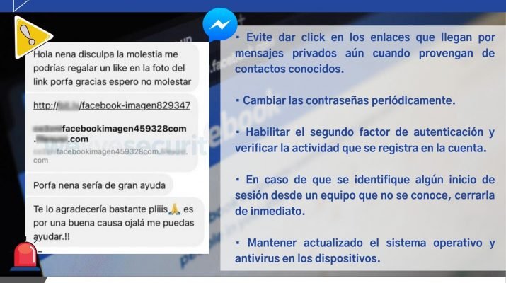 • Evitar dar click en los enlaces que nos llegan por mensajes privados aun cuando provengan de contactos conocidos. En este caso, se sugiere contactar al usuario por otra vía para verificar la veracidad del mensaje.
