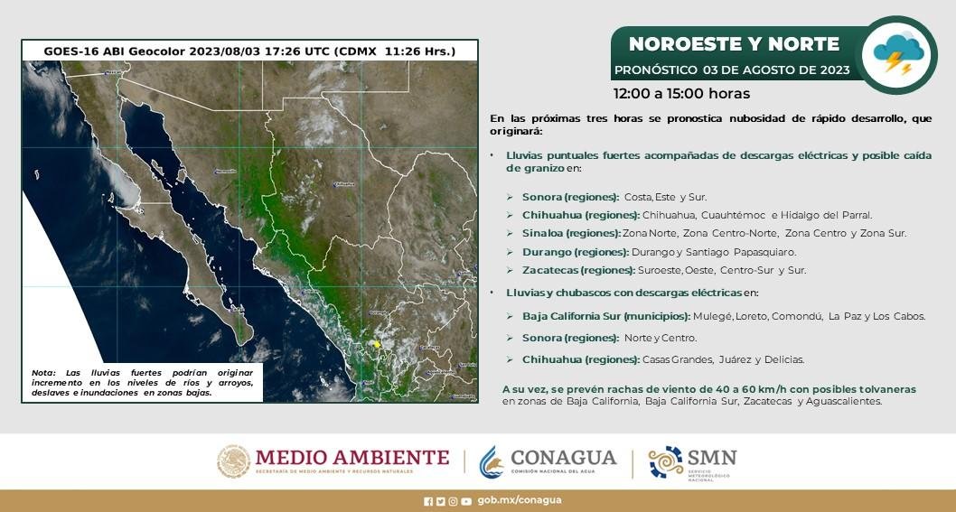La dependencia estatal advierte que las lluvias pueden estar acompañadas de actividad eléctrica y posible caída de granizo.