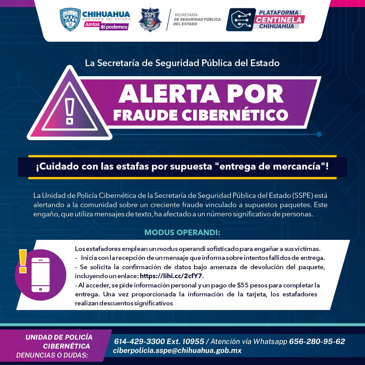 La Unidad de Policía Cibernética del Estado está comprometida en ayudar a la población. Para cualquier duda o mayor información, se puede contactar a través del teléfono 614 429-33-00, extensión 10955, en la línea directa: 614 429-73-15, en el WhatsApp: 656-280-95-62 y al correo electrónico: ciberpolicia.sspe@chihuahua.gob.mx, donde se atenderá a quien lo requiera.
