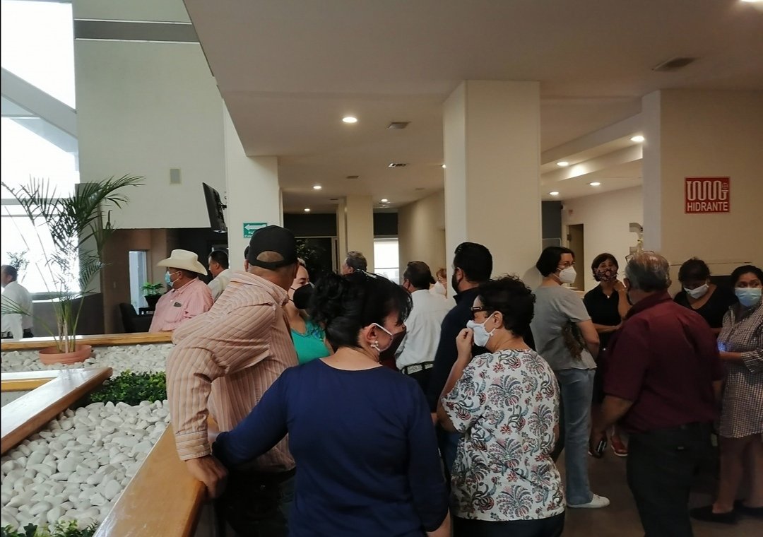 Un grupo de agricultores de la región centro-sur se manifestó en el interior del Hotel Casa Grande, en medio de un festejo del día de las madres que realizó Morena, esto para buscar al candidato a la gubernatura, Juan Carlos Loera de la Rosa.