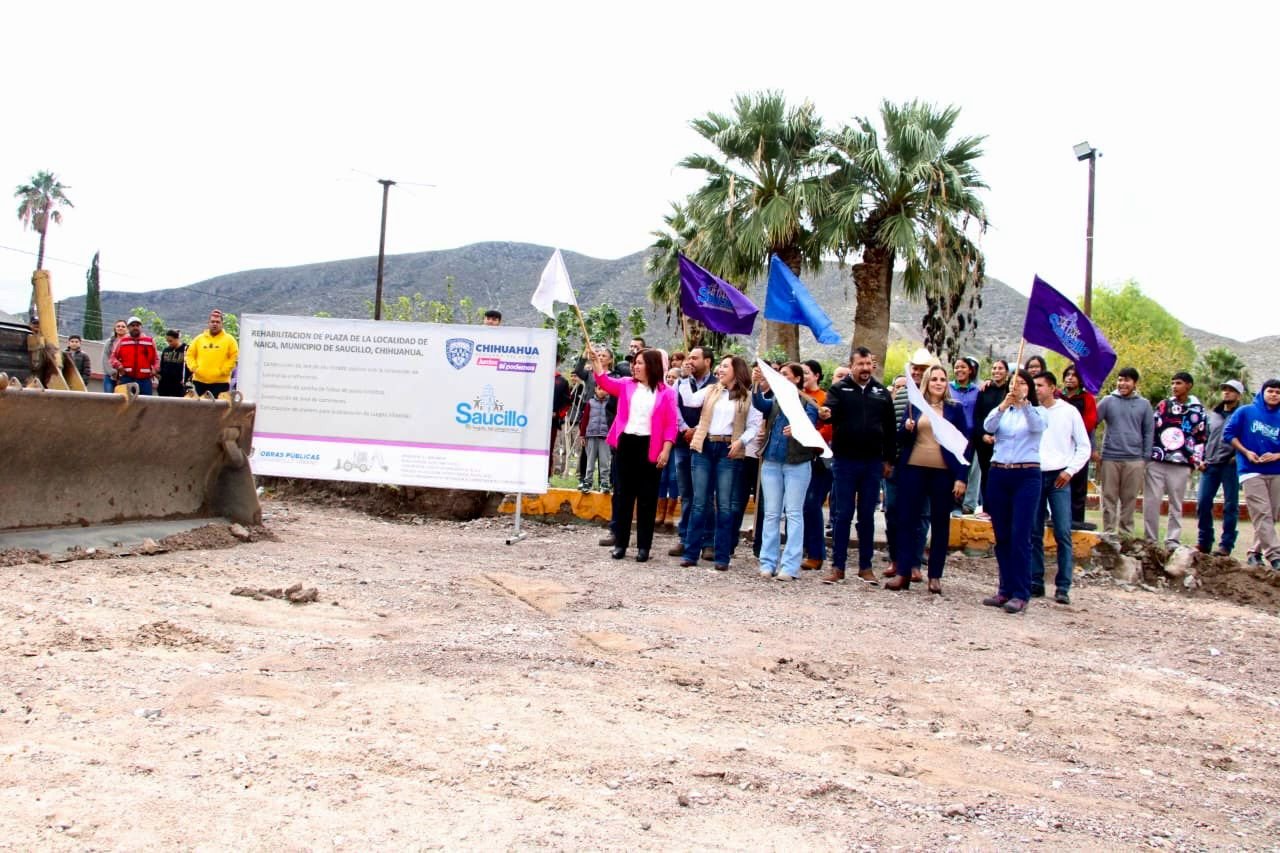 Aidé López De Anda, alcaldesa de Saucillo, encabezó el acto de inicio de la obra de rehabilitación en la plaza del Seccional de Naica. La ceremonia contó con la presencia destacada de regidores del ayuntamiento, miembros de la administración municipal, representantes de la Secretaria de Desarrollo Municipal de Gobierno del Estado, representantes de la empresa minera Peñoles y la presidenta del seccional de Naica.