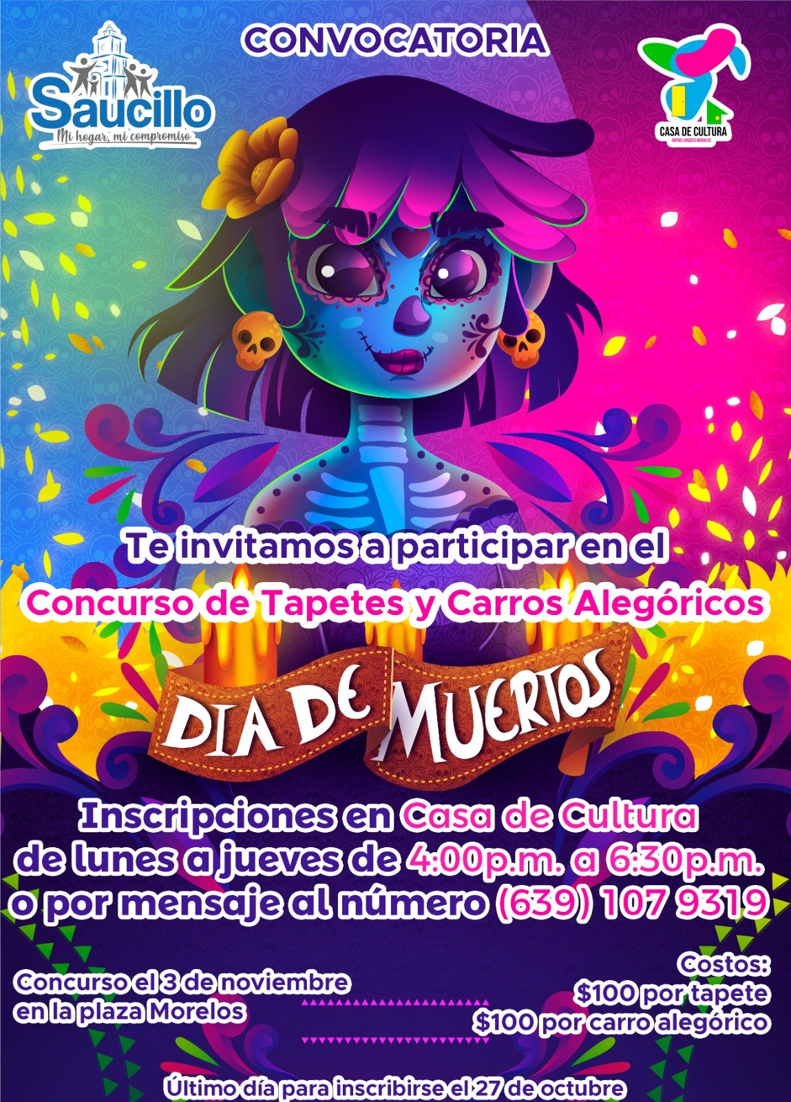 La alcaldesa de Saucillo, la Lic. Aidé López de Anda, a través de la Casa de Cultura, se complace en invitar a todos los saucillenses a unirse a la tradicional celebración del Día de Muertos participando en la creación de tapetes y carros alegóricos que adornarán la Plaza Morelos el próximo 3 de noviembre.