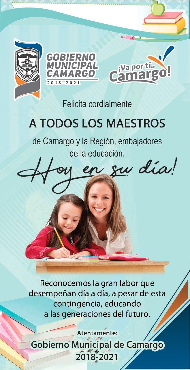 CAMARGO.- El Alcalde Arturo Zubía, envió una gran y cálida felicitación a los maestros en su día, así como a los padres de familia que debido a la pandemia están fungiendo como docentes desde casa.