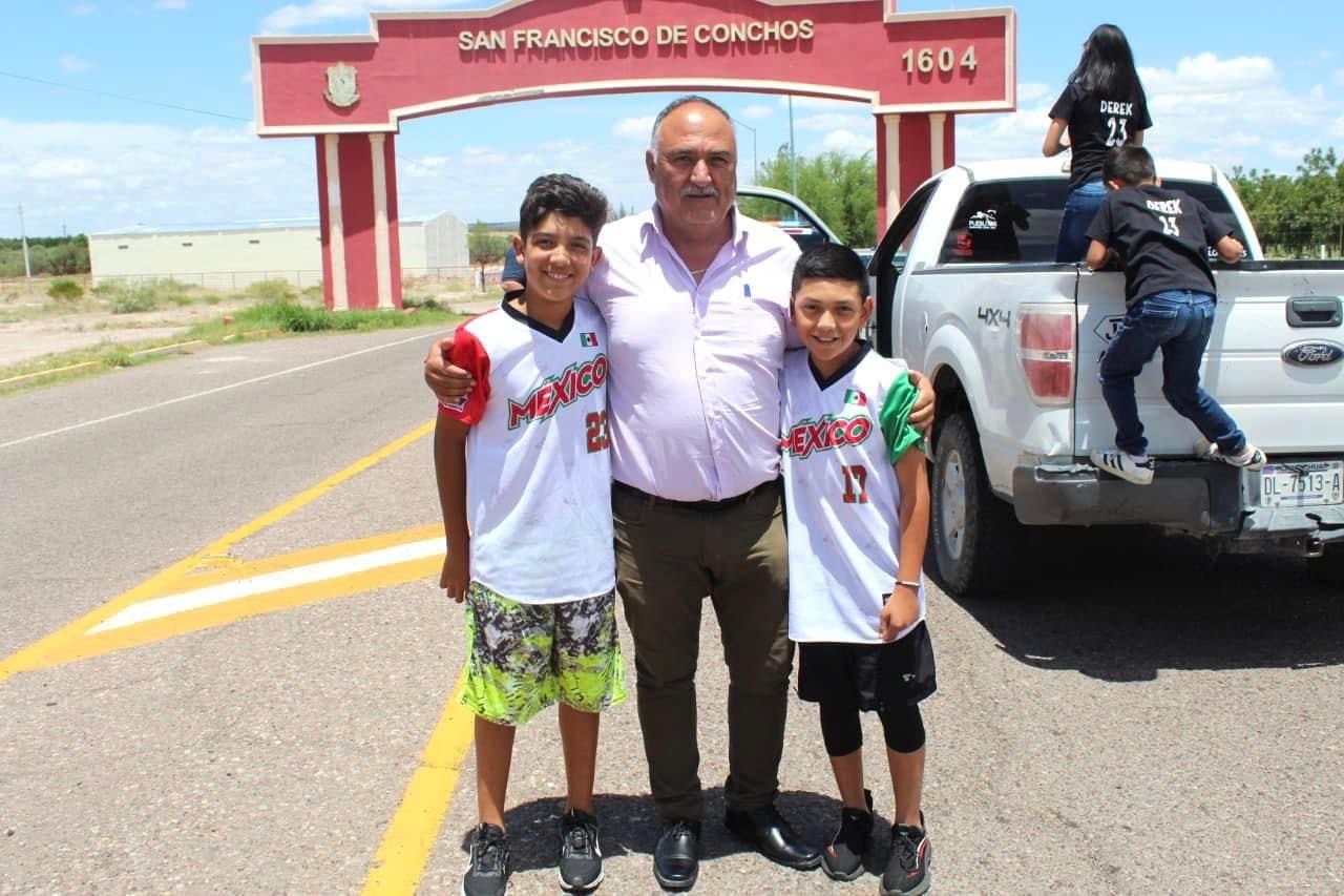 El alcalde de San Francisco de Conchos, Jaime Ramírez, recibió en el municipio a los niños Derek Carillo, Martin Villa Jr. y al coach Martin Villa quienes quedaron como subcampeones mundiales de béisbol en el torneo Pony League Sub 11.