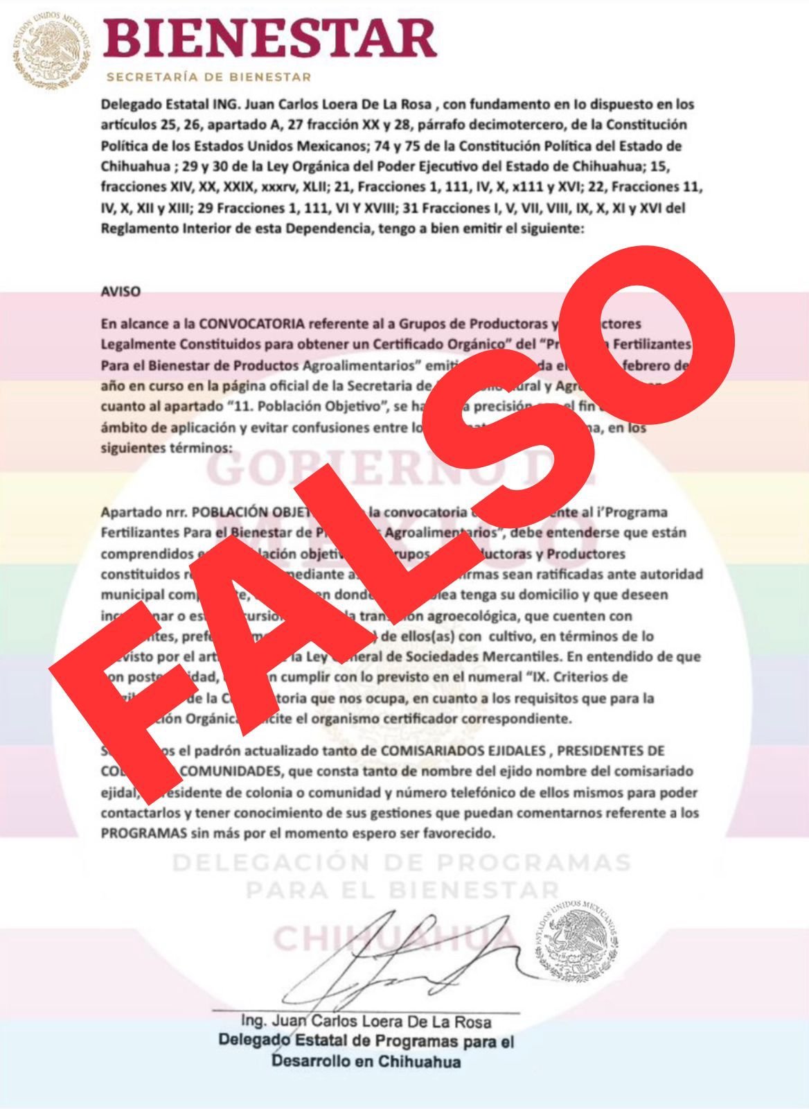 La Delegación Estatal de Bienestar y la Secretaría de Agricultura y Desarrollo Rural (SADER) alertó por un supuesto oficio girado por el delegado, Juan Carlos Loera de la Rosa, en el que se solicitan datos personales de comisariados ejidales, presidentes de colonias o comunidades para ser utilizados para el programa de “Fertilizantes para el Bienestar”, del Gobierno Federal.