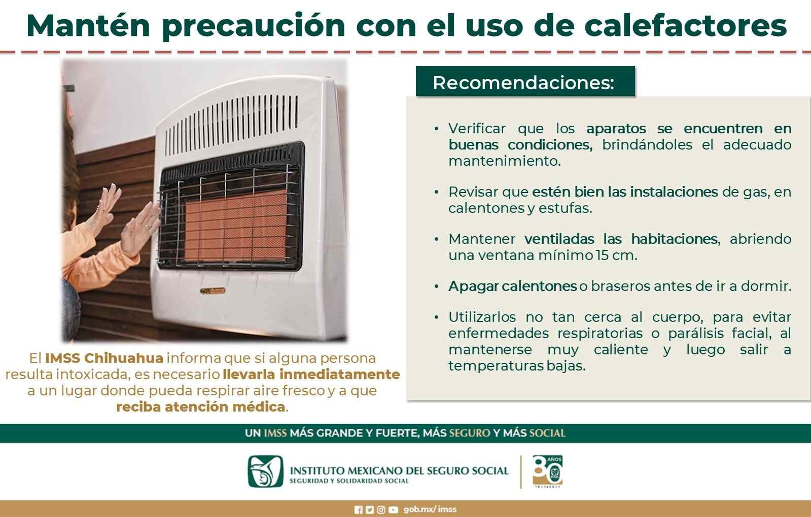 Ante la presencia de las bajas temperaturas en la entidad, el Instituto Mexicano del Seguro Social (IMSS) en Chihuahua, exhorta a la ciudadanía para que extremen cuidados con los calentones, ya que un mal uso de los mismos podría causar una intoxicación en quienes habiten la vivienda.