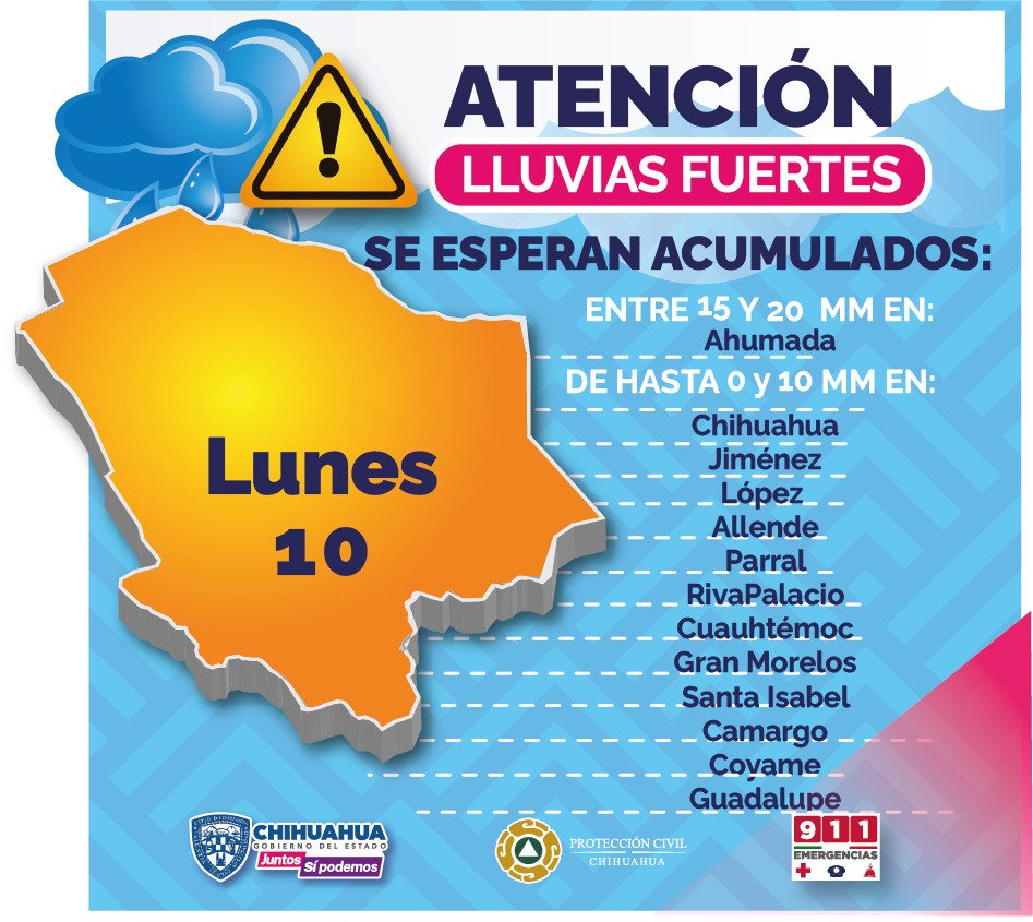 De tal forma, se prevén lluvias para los municipios de Chihuahua, Jiménez, López, Allende, Parral, Riva Palacio, Cuauhtémoc, Gran Morelos, Santa Isabel, Camargo, Coyame y Guadalupe.