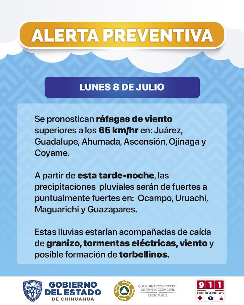 En localidades como Guadalupe, Palomas, Madera, Gómez Farías, Matachí, Namiquipa, Bachíniva, Guerrero, Julimes, Coyame, Ojinaga, Ahumada, Ascensión, Nuevo Casas Grandes, Ignacio Zaragoza, Buenaventura, Balleza, Cuauhtémoc, Riva Palacio, Gran Morelos, Santa Isabel, Chihuahua, Aldama, Meoqui, Delicias, Naica y Camargo, se esperan precipitaciones aisladas.