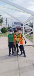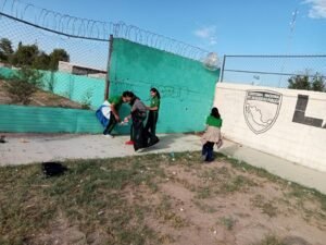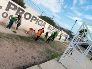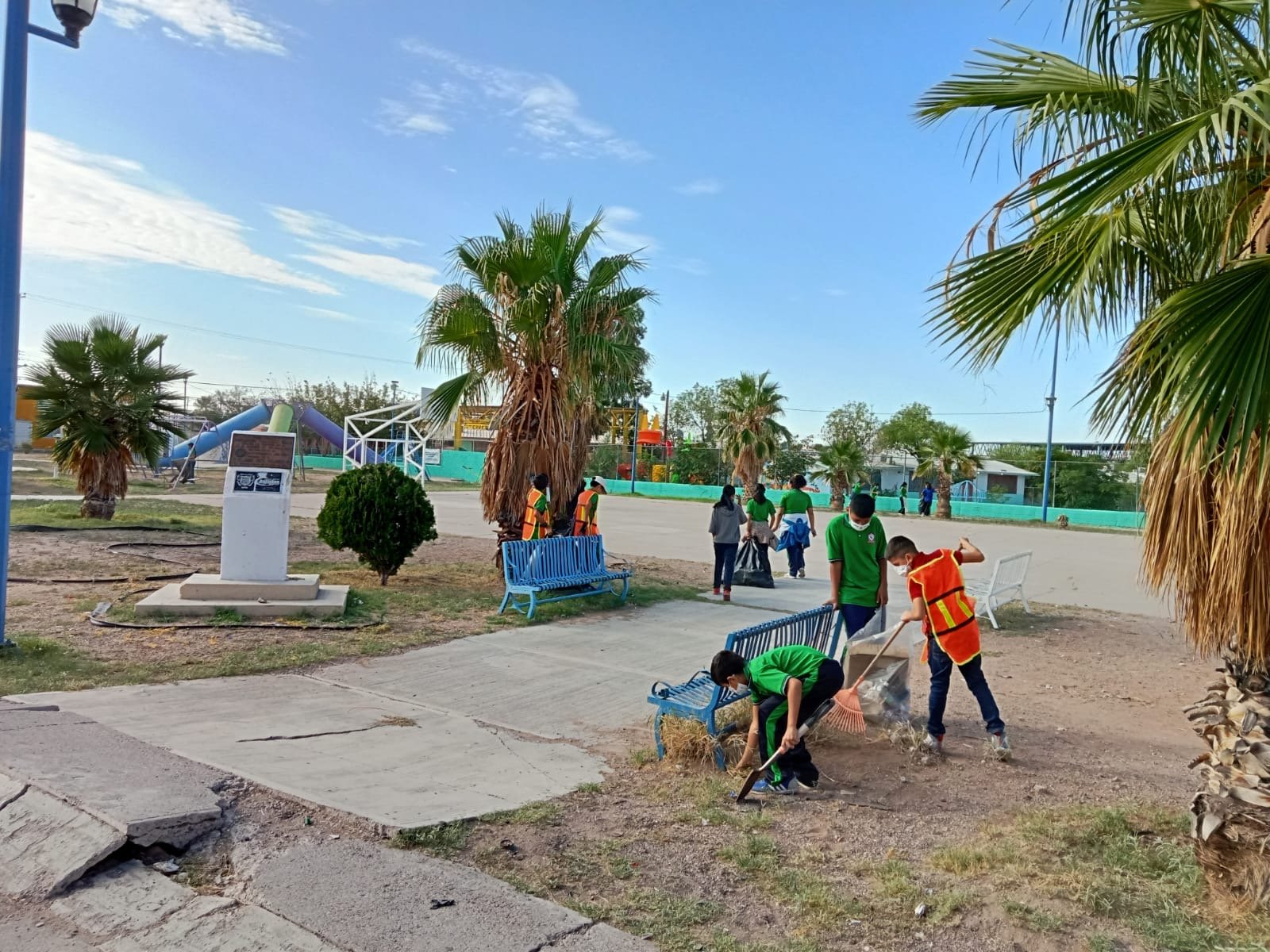 La limpieza se realizó alrededor del plantel ubicado en la colonia Ricardo Flores Magón y en la plaza aledaña, donde recogieron basura y quitaron la hierba y maleza de las banquetas y espacios.