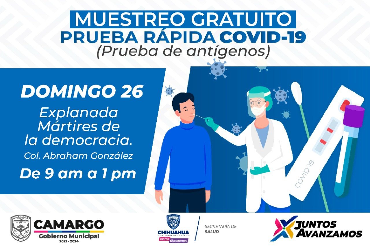 Buscando disminuir y mantener bajo control los contagios de Covid-19 en el municipio, el Gobierno Municipal de Camargo en coordinación con la Región Sanitaria Camargo, obtuvieron pruebas de antígenos que serán aplicadas de manera gratuita este domingo en la colonia Abraham González.