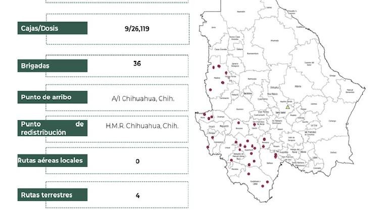 Tras su arribo en Chihuahua, y bajo custodia del Ejército Mexicano, comenzará la distribución de la vacuna con cuatro rutas terrestres, para que lleguen a 36 centros de vacunación ubicados en 12 municipios del estado.
