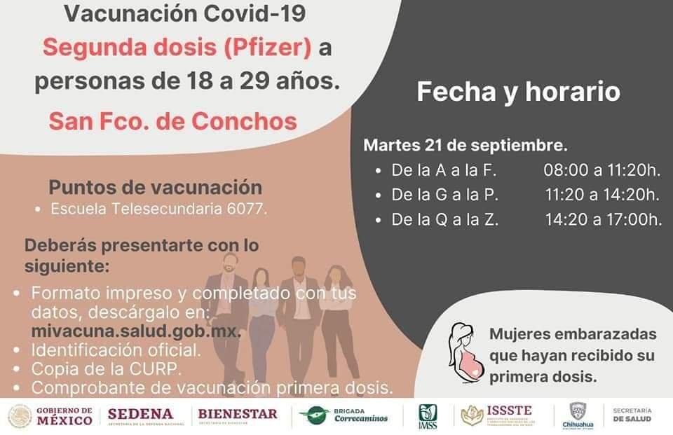 El martes 21 de septiembre estarán aplicando la segunda dosis a personas de 18 a 28 años en el municipio de San Francisco de Conchos y La Cruz.
