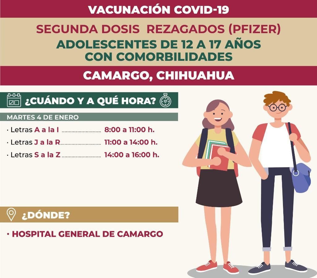 El próximo martes 4 de enero se llevará a cabo la aplicación de la segunda dosis a rezagados y adolescentes de 12 a 17 años con comorbilidades en el municipio de Camargo.