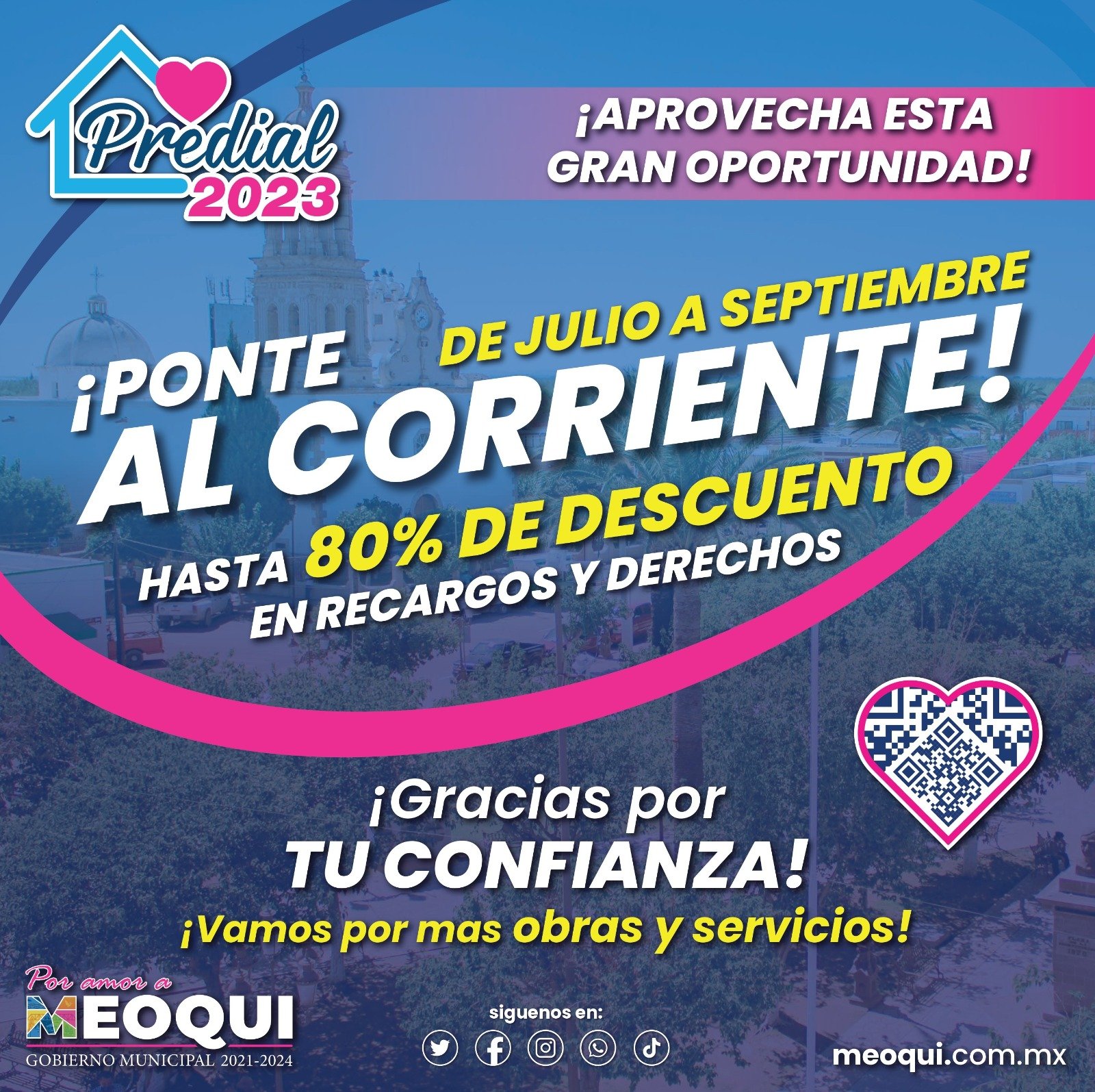 Con descuento de hasta el 80 por ciento en recargos y derechos del predial arrancó la Campaña “De Julio a Septiembre Ponte al Corriente” en Meoqui, donde el Gobierno Municipal de Meoqui encabezado por la alcaldesa Miriam Soto, a través de Tesorería Municipal, lanzó este programa con el objetivo de que los contribuyentes se pongan al corriente.