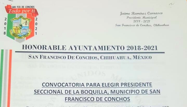 San Francisco de Conchos.- El Gobierno Municipal de San Francisco de Conchos, a través del Ayuntamiento convocan a los interesados en participar en la elección de presidente seccional de La Boquilla, para presentar su solicitud a partir de este lunes 1 de octubre.