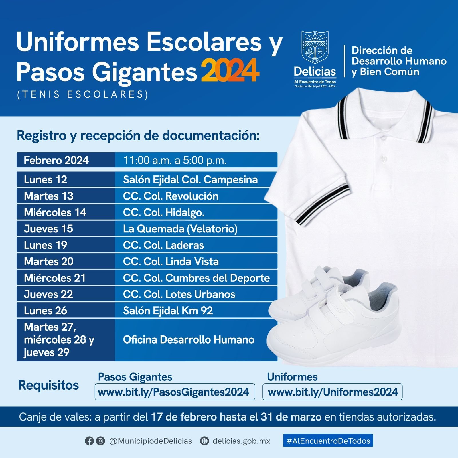 Este lunes, el personal de la Dirección de Desarrollo Humano y Bien Común estará presente en el salón Ejidal de la colonia Campesina para recibir la documentación de aquellos interesados en aplicar al programa “Uniformes Escolares y Tenis Escolares 2024”.