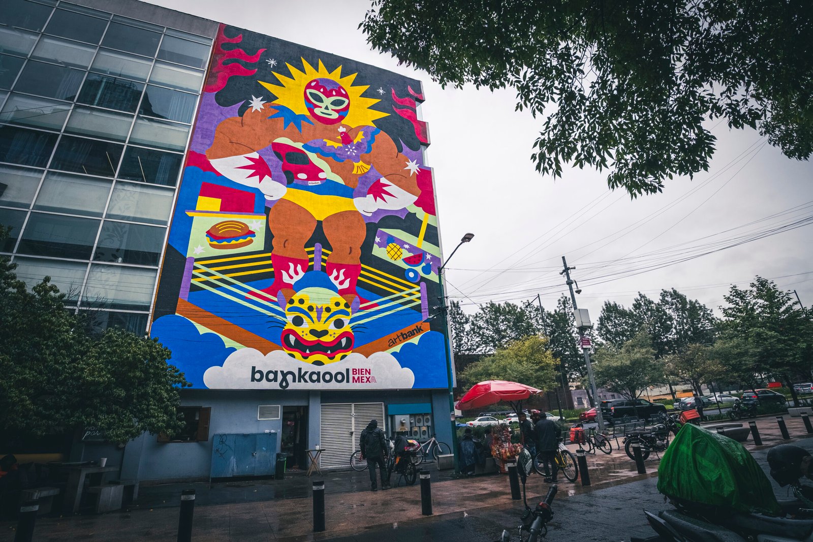 Fiel a su trabajo que combina figuras femeninas, simbolismos naturales, colores vivos y figuras humanoides con simbolismo, podemos ver otro mural que gira en torno a la lucha libre.