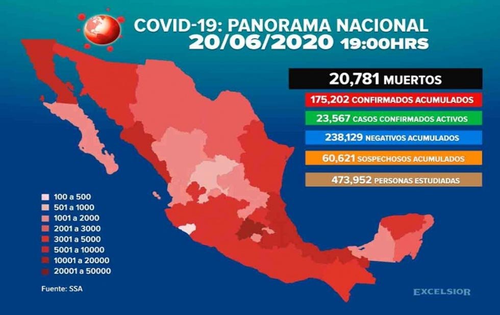 México.- De acuerdo con cifras oficiales, ya suman 20 mil 781 muertos por la pandemia de Covid-19 que afecta a México hasta este sábado 20 de junio, mientras que la cifra de contagios por este patógeno asciende a 175 mil 202 casos.