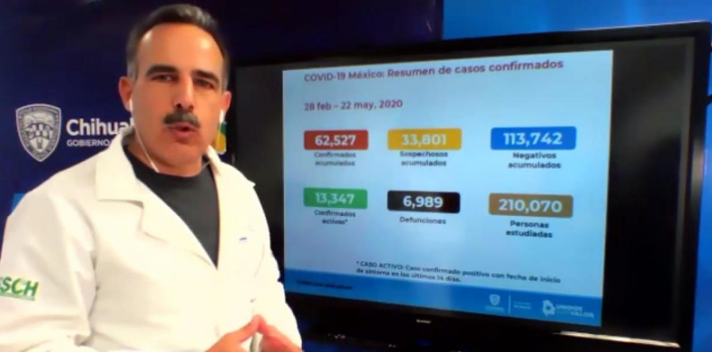 CHIHUAHUA.- El director de Salud Zona Norte, Arturo Valenzuela Zorrilla informó que Chihuahua presenta al corte del 23 de mayo un total de mil 400 casos de coronavirus (COVID-19) confirmados en 33 municipios, 261 decesos, 381 recuperados, 997 sospechosos y mil 857 descartados.