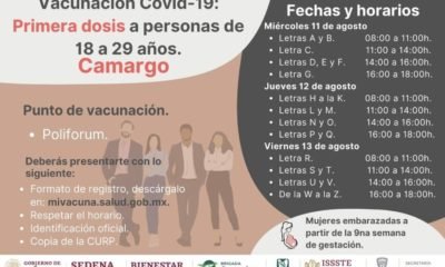 Este miércoles 11 de agosto iniciará la aplicación de la primera dosis a personas de 18 a 29 años en el municipio de Camargo, en el...