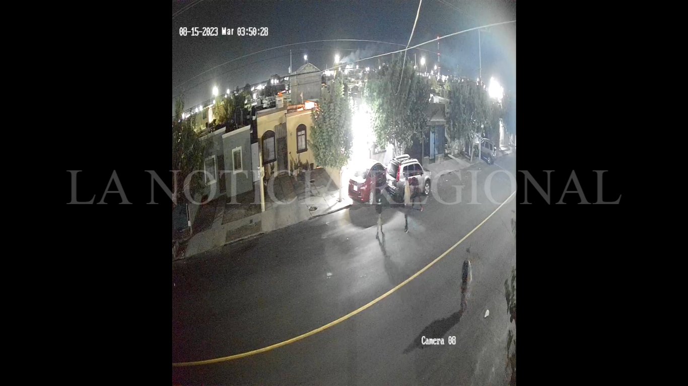 A través de un video de las cámaras de seguridad de un domicilio, se pudo observar a un grupo de jóvenes que pasaban por la avenida Los Manzanos, en el fraccionamiento Las Palmas y uno de ellos con un arma blanca pinchó una de las llantas de un vehículo.