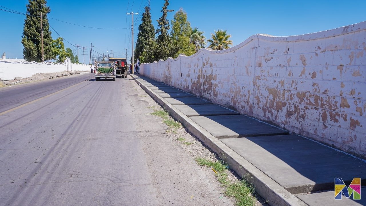 Luego de la demolición en el ala izquierda de la banqueta del Panteón Municipal del municipio de Meoqui, trabajan en el colado de guarniciones en esta área, así lo informó Ulises Escobar, director de Obras Públicas Municipales, quien compartió que la rehabilitación lleva un avance del 65 por ciento.