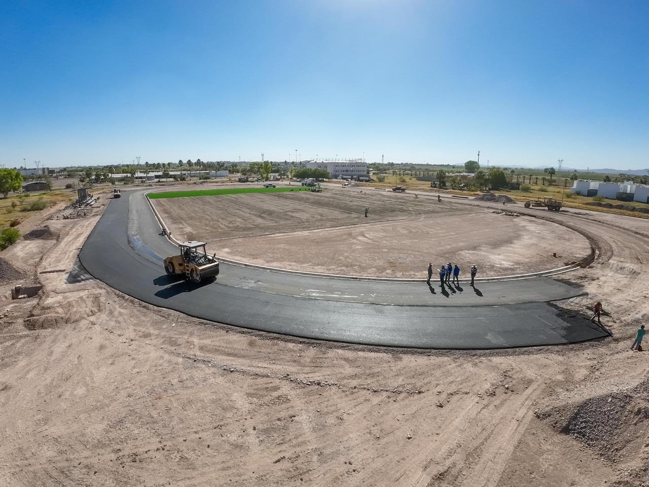 Avanza colocación de carpeta asfáltica en pista de atletismo en Delicias