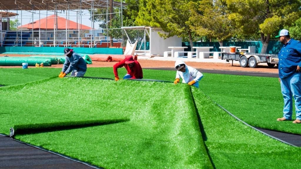 La colocación del pasto sintético en el campo 4 del complejo de softbol “Fernando Baeza Meléndez” se encuentra a un 30% de avance, se espera que en máximo un mes esté listo ya este proyecto, apoyado por el presidente municipal Jesús Valenciano.