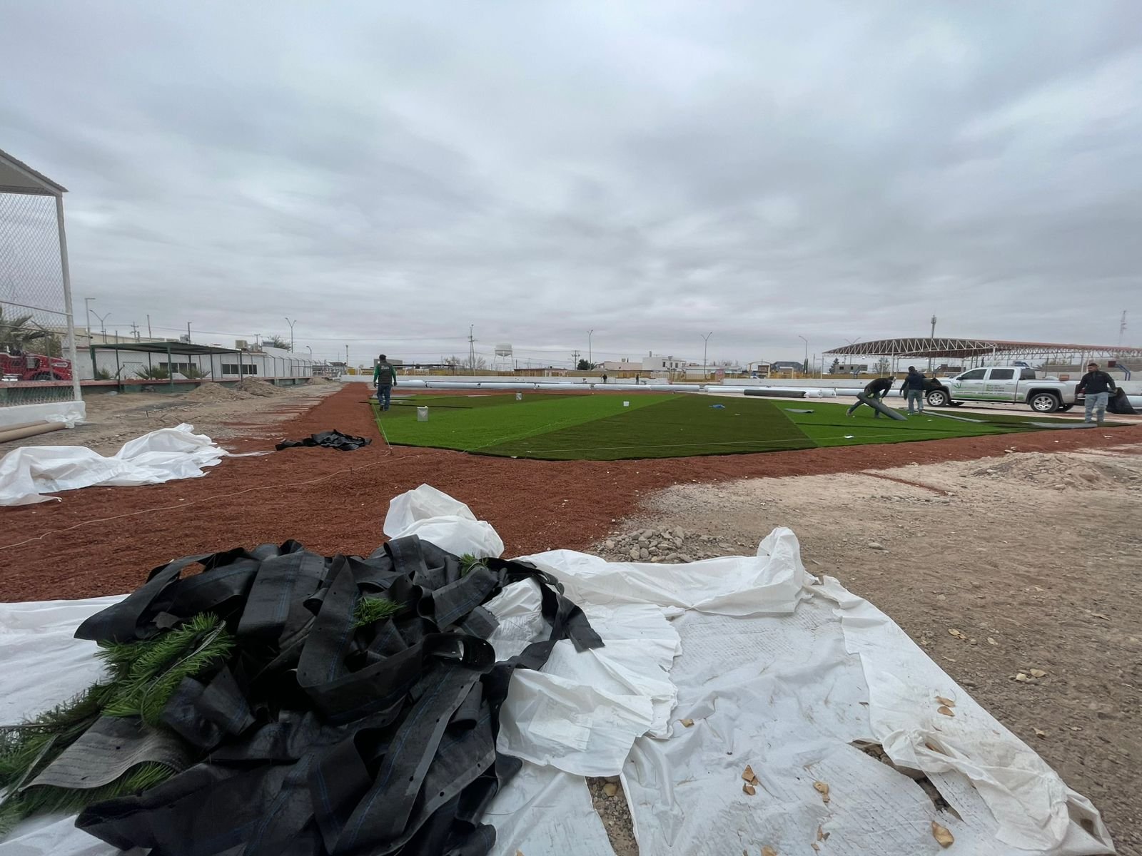 El funcionario explicó que en días recientes se trabajó en la aplicación de arcilla en las áreas correspondientes a las zonas de corredores, como parte de la preparación del terreno, y que este lunes comenzó la llegada y colocación del pasto en el campo.