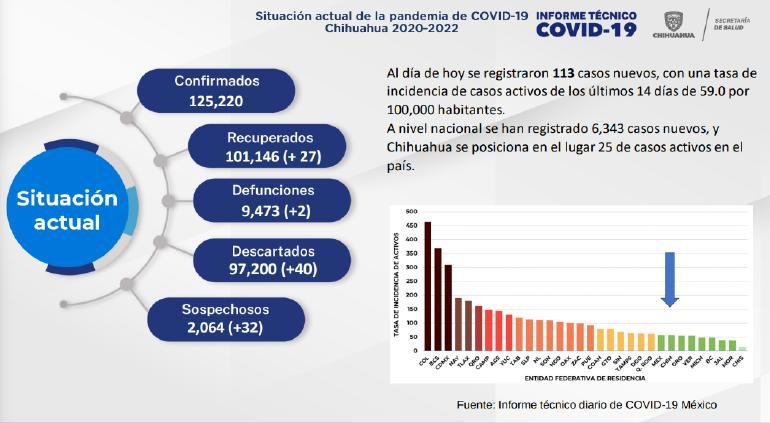 Informaron que en el estado se tiene un acumulado de 125 mil 220 contagios (+113 el último día), 9 mil 473 muertes (+2 el último día), hospitalizados a la fecha: 255 (-15 el último día) en los 27 hospitales públicos de la Red IRAG e intubados: 55 (+2 el último día).