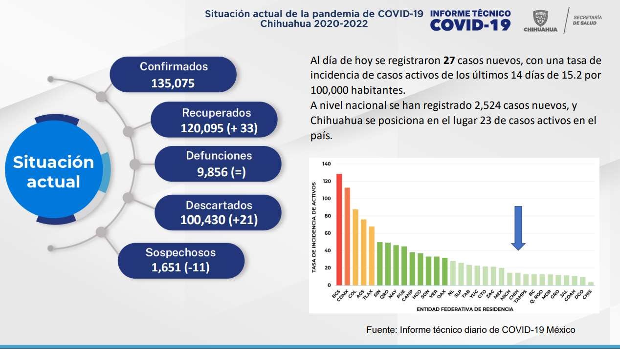 Los casos confirmados ascendieron a 135 mil 75 (+27) y los casos nuevos se concentraron en los municipios de Juárez (+16) Chihuahua (+11).