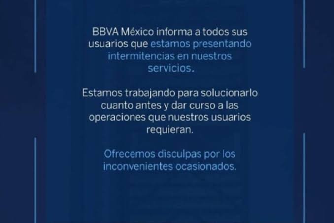 A su vez, BBVA México avisó en sus redes sociales que hasta el momento todos sus servicios presentan intermitencia por lo que esperan que pronto se restablezcan sus operaciones.