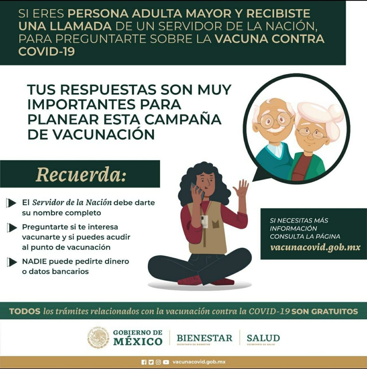 Comentaron que un servidor llama para saber si en beneficiario vive, luego pregunta si desea aplicarse o no la vacuna contra el COVID-19, si cuenta con manera de trasladarse al puesto de vacunación o si se encuentra en estado de postración para que alguien acuda a vacunarlo a su domicilio. Todo esto aseguran se realiza con el objetivo de tener una mejor planeación de la campaña de vacunación.