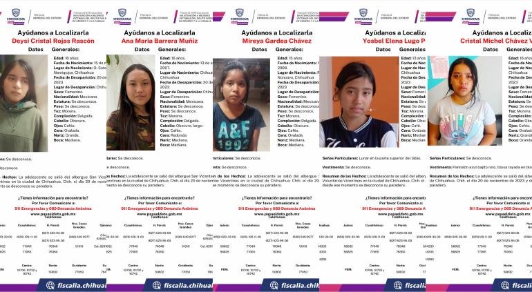 La Fiscalía General del Estado publicó las pesquisas de cinco jovencitas que salieron de dos albergues diferentes en la ciudad de Chihuahua y se desconoce su paradero.