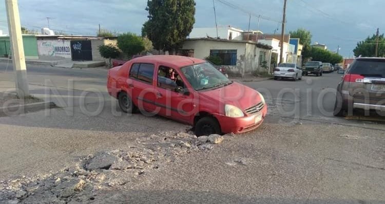 Un vehículo cayó en una zanja que quedó después de trabajos de la Junta Municipal de Agua y Saneamiento (JMAS) y vecinos exigen que se repare.