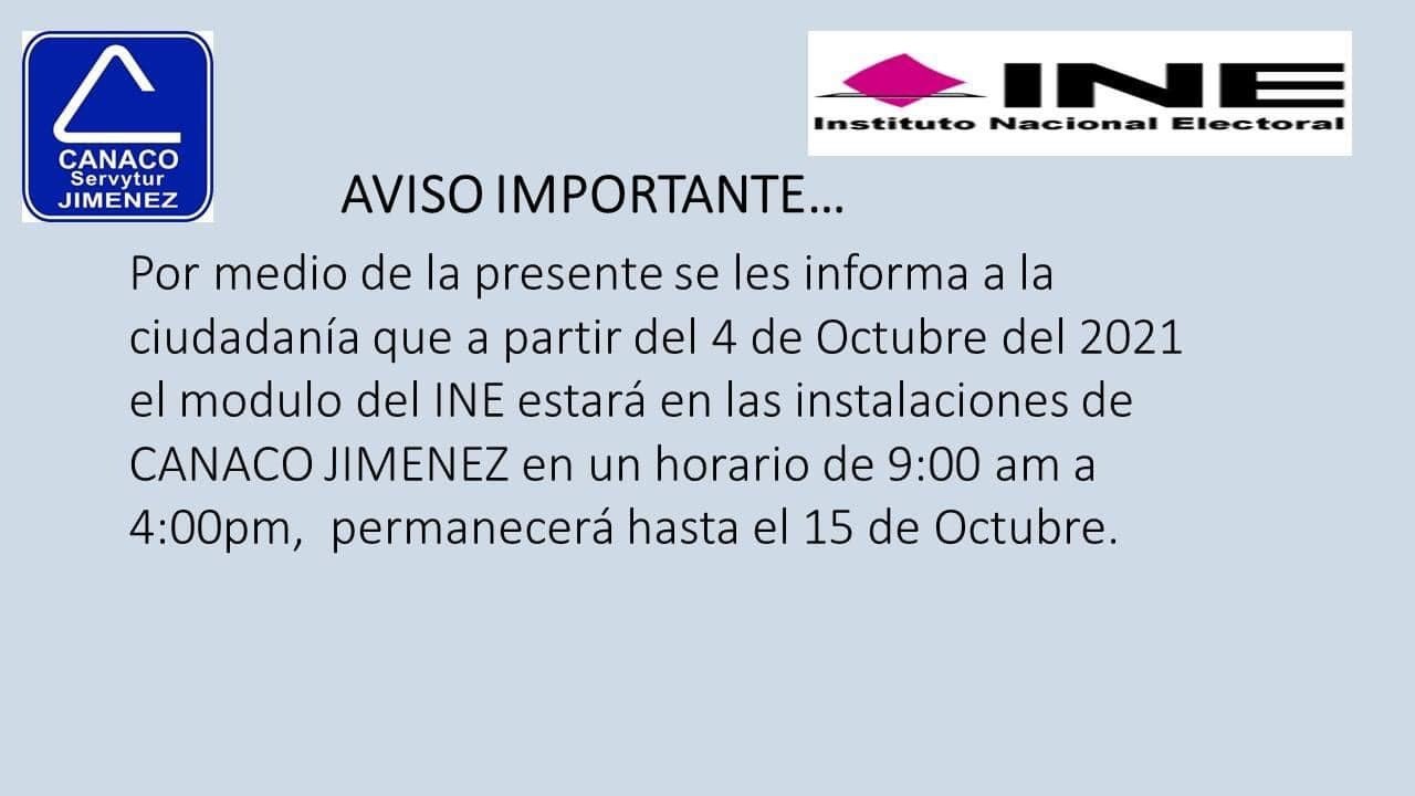 La Cámara de Comercio Jiménez dio a conocer las nuevas fechas para la instalación del módulo del Instituto Nacional Electoral en la localidad, este estará disponible del día 4 al 15 de octubre, teniendo un horario de atención de 9 de la mañana a 4 de la tarde.