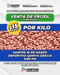 Con el objetivo de apoyar la economía de las familias camarguenses y acercar productos básicos a bajo costo, el Gobierno Municipal de Camargo 2024–2027 invita a la ciudadanía a participar en la venta de frijol subsidiado que se realizará en próximos días.