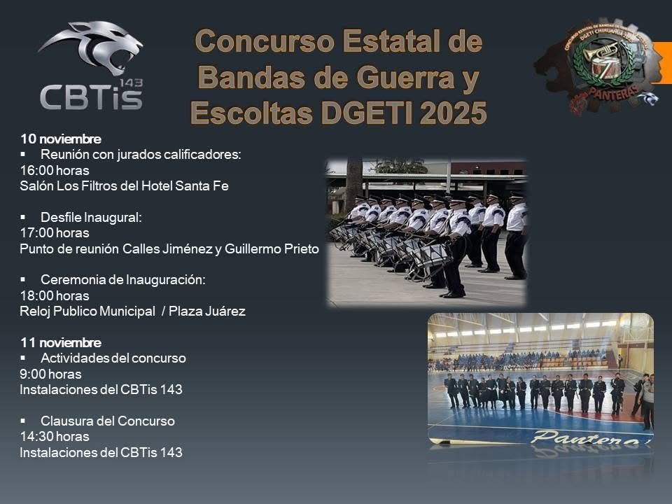 Ciudad Camargo se prepara para recibir a estudiantes de todo el estado con motivo del Concurso Estatal de Bandas de Guerra y Escoltas DGETI Chihuahua 2025, que se llevará a cabo los días 10 y 11 de noviembre, con la participación de 17 planteles provenientes de distintos municipios.