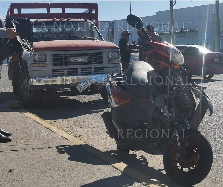 Esta última unidad quedó bajo la pesada unidad. La mujer que tripulada el vehículo de dos ruedas cayó al asfalto y fue atendida por Técnicos en Urgencias Médicas de Cruz Roja delegación Delicias.