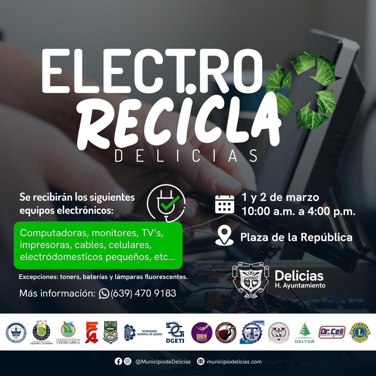 La jefatura de Medioambiente del Gobierno Municipal de Delicias llevará a cabo la campaña “Electro Recicla” los días 1 y 2 de marzo en la plaza de la República. Esta iniciativa tiene como objetivo principal la recolección de basura electrónica para su adecuado reciclaje y disposición final.