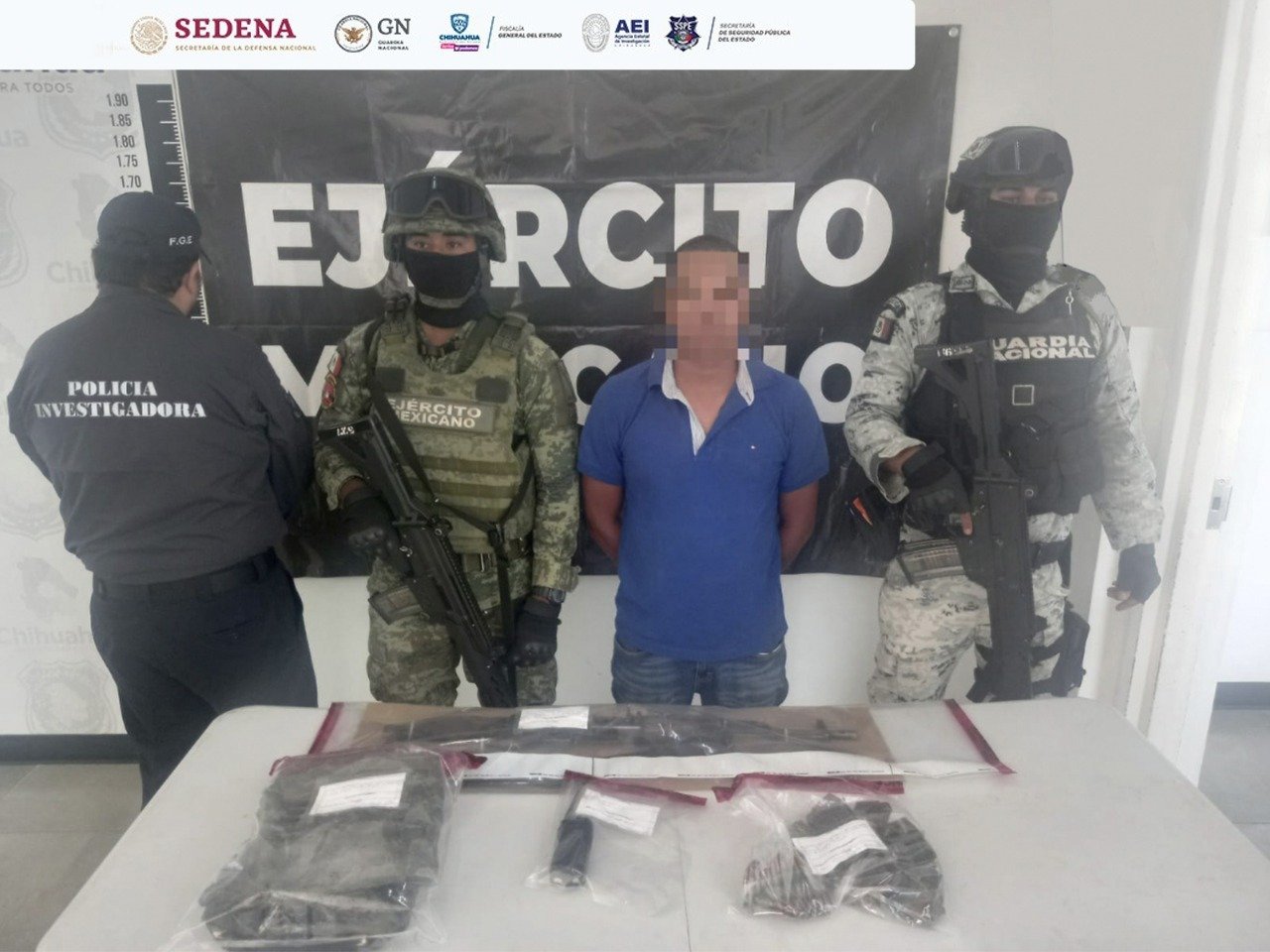 Este sujeto se ocultaba entre unos matorrales y al verse sorprendido por los agentes, corrió hacia el monte, pero fue alcanzado por los elementos que integran el operativo y una vez detenido, se le aseguró el fusil calibre 7.62 X 39mm, abastecidos con 101 cartuchos, un radio de comunicación portátil y un chaleco táctico con camuflaje en color verde.