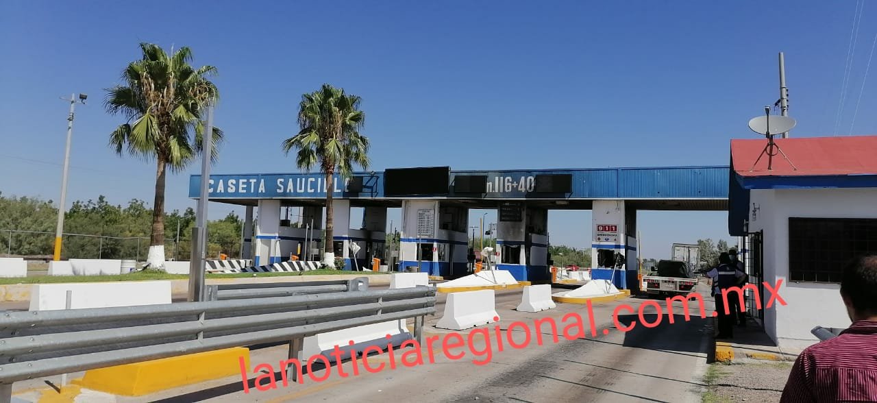 La caseta de peaje de Saucillo se encuentra totalmente destruida, desde vidrios hasta monitores, haciendo imposible reanudar operaciones, por lo que el paso está fluyendo sin cobro.