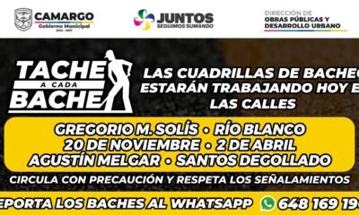 El Gobierno Municipal de Camargo informa que este miércoles, las cuadrillas del programa ¡Tache a cada bache! estarán trabajando en las siguientes calles: Calle Gregorio M....