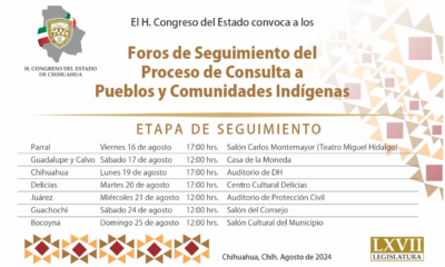 El Poder Legislativo de Chihuahua comenzará este viernes en Hidalgo del Parral, los Foros de Seguimiento del Proceso de Consulta a Pueblos y Comunidades Indígenas. Es...